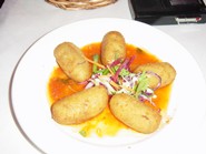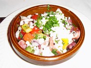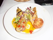 そうこうしているうちにタパスが運ばれてきました。最初に出てきたオクトパスは、カララフルなピーマンや、セロリ、そしてトマトなどと一緒にシェリー・ビネグレットにマリネートされたもので、決して酸っぱ過ぎない味付けが私達日本人の舌にも良く合います。次に出てきた定番のガーリック・ポテトサラダは、このお店の名物の一つというだけあってマヨネーズのアッサリした味付けも美味しく、何よりもガーリックの風味がサングリアのグラスを傾けます。ただし、ガーリックの後味がかなり凄いので、食後にちょっと辟易するかもしれませんのでご注意。ニンジンやキャベツ、トマトとバジルのソースと一緒に出てきたコロッケや、焦げ目のしっかりついたまったりとした味付けのイカのグリルも○。もう一つの定番メニューでもある冷たいスパニッシュオムレツは、他店のようにしょっぱ過ぎず、玉子の風味が楽しめるのがグッド。ただし大き目のポテトは美味しいのですが、もう少し玉子が多くても良いのでは?という意見もありました。