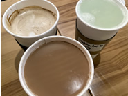 隣にある「Cloud Tea」のドリンクも注文できるので、食後に抹茶ラテとブラウンシュガーラテ、ミルクティーをホットで頼みました。全てタピオカを追加で入れてもらったのですが、ブラウンシュガーラテはシンプルにコーヒーとして飲むほうが美味しいので、タピオカ無しのほうがしっくりくる感じでした。やはりタピオカは濃厚なミルクティーに合わせるのがベストな気がします。ただホット・ドリンクにタピオカを入れた場合は、熱さでタピオカが溶けてしまうので、独特の食感を楽しみたい方はタピオカは早めに食べたほうが良さそうです。ちなみにドリンクだけを注文する場合は、入り口近くにあるタッチ画面の機械でセルフオーダーも可能。ミルクの種類や甘さ加減もカスタマイズできますし、カードで支払いも出来るのでとても便利です。