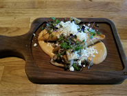 今回はV(Vegetable)メニューからChickpea Fritterと、M(Meat)メニューからWood Oven Roasted Pig Face、そしてGOATSメニューからGoat EmpanadasとGoat Liver Mousseをオーダーしました。小さな揚げ出し豆腐のようなChickpea Fritterはすり潰したひよこ豆を固めて揚げたもので、カリッと香ばしいフムスのようです。周りには練りごまと酢を合わせたタヒニソースで和えたキノアと、パセリをたっぷり使ったタブーレサラダ、それにフェタチーズを散らした中東系色の強いお料理ですが、ゴマや酢の味付けが日本人には親しみやすくどこか懐かしさも覚える一品でした。