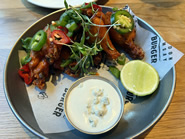 まず、アペタイザーにHellsfire Chicken Wingを注文しました。Hellsfireのチキンウィングは、ハラペーニョがたくさん乗っているので、一見するとかなり辛そうですが、食べてみると塩味も辛味もちょうどよく、チキンの香ばしさとジューシーさが最高です。添えてあるライムを絞ると、爽やかな香りが広がり、軽やかな味わいにまとまります。何もつけなくても十分に美味しいのですが、サイドについてくるブルーチーズ入りのソースをつけると、まろやかさとコクが加わって味の変化が楽しめます。ソースはマイルドでクセのない仕上がりになっているので、ブルーチーズがあまり得意でないという方でもこちらは大丈夫かもしれません。