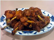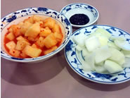 まずは韓国人の友人が絶賛するHot and spicy chicken wingsを注文しました。これは店内にいた全てのお客さんが食べていたと言っても過言ではないくらいの一番人気メニューで、揚げた鶏肉に名古屋風の甘辛いタレが絡めてあります。てんこ盛りになったチキンはテーブルに置かれた瞬間に醤油と砂糖のいい匂いが漂い、口に入れると甘辛のソースがジュワーッと染み出してきます。チューリップ型に揚がったチキンは、とりわけお肉が柔らかいというわけではないのですが、とにかくソースのうまみが後引く美味しさで絶品。手がベトベトになるのも構わず、次から次へと食べてしまいました。ちなみにチキンを待っている間に、前菜としてカクテキと生の玉ねぎをカットしたもの、それにチュンジャンという黒味噌にカラメルを和えたものが出てきました。カクテキはかなり酸味が強い韓国人うけするものですが、玉ねぎにチュンジャンをつけて食べるとカラメルの甘みと玉ねぎの辛さが相まって、いい具合に食欲をかきたてられます。