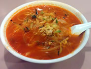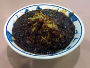 メインに頼んだJambong (Red Sauce Noodle)は、唐辛子パウダー入りの真っ赤なスープに、炒めたきゅうりや玉ねぎ、ネギ、人参、豚肉、それに海老などがたっぷりのった韓国風のチャンポン麺です。炒めた具が薄味に仕上げてあるので、それぞれの素材の味が楽しめるだけでなくスープの旨味をさらに引き立てていて◎。麺にはあまりコシはありませんが、貝のダシがよく効いたスープの辛さがちょうどよく満足いく味わいです。次に前評判の高かったJajangmyung (Black Bean Noodles)をオーダーしました。麺が見えないくらいにどっぷりとソースがのったジャージャー麺は、スタッフが食べやすいようにハサミで切ってくれます。柔らかめの麺に玉ねぎと人参、チュンジャンで炒めた挽き肉入りの甘いソースの組み合わせは、給食で食べたようなどこか懐かしさを覚える味わい。単調な味つけに途中で飽きてきたら、前述した生玉ねぎを混ぜあわせて食べると、辛さと食感の幅が広がって二度楽しめます。