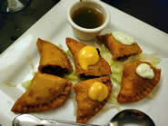 アペタイザーに頼んだ魚介のマリネ「Ceviche」は、新鮮なシーフードに野菜やマンゴー、アボカドを合わせたもので非常に美味です。3種類のエンパナーダ「Trio Empanadas」は、中身はケソ・マンチェゴ(スペイン系チーズ)とチキン、ピカディージョ(牛挽肉とトマトを使ったラテンアメリカの伝統料理)があります。サイズは小ぶりですがどれもジューシーな味わいで、お好みでサイドについてくる特製ソースをつけていただきます。