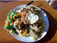 揚げたての春巻きはサクサクの皮の中に、キャベツやニンジン、米粉麺などの具が入っています。しっとりとした野菜の甘みがあり、甘酸っぱいスイート&サワーソースがよく合うので、ついついお箸がすすみます。鶏もも肉を生姜入りのスープで茹でたカオマンガイは、ふっくらとジューシーな鶏の旨味を生姜の香りでさっぱりといただけます。そのままでも十分に美味しいのですが、粗みじん切りにした生姜とチリを合わせたピリ辛ソースをつけると味に一層深みが出るようで、ゴロゴロと切った生姜の入りのチキンスープで炊いたジャスミンライスとの相性も抜群。添えてあるキュウリは良い口直しになりますし、サイドのチキンスープもホッとする優しい味わいで、心身ともに温まりました。今回選んだ二種類のカレーがジャスミンライスの上にたっぷりとのったボリュームたっぷりのKhao Rad Gangは、ピーナッツペーストを使ったペナンカレーが濃厚な味わいで、辛さ具合も強すぎずちょうどよい感じ。鶏肉とタケノコが入ったグリーンカレーはココナッツミルクにナンプラーやレモングラス、こぶみかんなどのタイ独特の食材やスパイスが利いていて、こちらも辛さは控えめで食べやすいです。Pad Horapaはメインの具にチキンか豆腐を選べるので鶏肉で作ってもらいました。さやいんげんやイエローパプリカ、玉ねぎなどの野菜とスイートバジルなども入っているので、どことなくガパオガイ(タイの鶏肉のバジル炒め)にも似ていますが、濃い目の味つけがジャスミンライスにピッタリです。また追加で頼んだ目玉焼きのトロトロとした半熟の黄身が、味に変化を与えてくれるので飽きることなく食べられました。