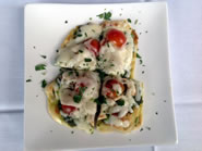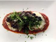 ブランチとランチはアラカルトでも注文できますが、ディナーは5種類のコース料理と3種類のコース料理のみになります。今回は前菜とスープ、サラダ、メインそしてデザートのついた5種類のディナー・コースを2人分オーダーし、それぞれ違う内容のお料理を頼んでみました。この日の前菜には素揚げした芽キャベツにマヨネーズ・ソースを添えたものと、Chicken Pest Flatbreadが出てきました。油でさっくりと揚げた芽キャベツは、外側の葉は口の中でホロっと崩れるほどクリスピーで、内側の茎の部分はホックリと柔らか。軽く塩をふっただけの味付けなので、芽キャベツそのものの甘みと旨みが際立っています。甘酸っぱいトマトとチキンがのったフラット・ブレッドは、残りのコース料理が食べられるかな、と心配になるほどの大きさにびっくり。次にタイカレー風のチキン・スープとほうれん草の入りのトマト・スープが出てきました。どちらも色鮮やかなスープで、こってりと濃いめの味つけがされています。ココナッツ・ミルク入りのタイ・カレー風のチキン・スープは、野菜がたっぷり入った具沢山のスープで、食べた後にじんわりとした辛さがあります。クラッシュ・トマト入りのスープは、酸味の効いたさっぱり味で野菜の甘い香りが口いっぱいに広がります。サラダにはパリッとしたレタスに特製のドレッシングが程よく絡まったシーザー・サラダと色合いや食感のよいミックス・グリーンが用意されていました。