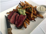 メインのHanger Steakは外側がカリッと焼き目がついていて、とってもジューシー。お皿にのったバター・ソースをつけると、お肉が一層しっとりとしてコクのある味わいにまとまります。山盛りになったサイドのSeasoned Friesも中がホックリと甘くてボリュームも満点。もう一品のCrispy Eggplantは表面がサックリ、中はふんわりトロトロとしていて、上にはチーズやレッド・ベルペッパーがのっています。お皿に敷いたトマト・ソースのガーリックとオリーブ・オイルの風味が、甘い焼き野菜のうまみを引き出した、あっさりとした一品です。