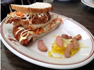 メインにはBreakfast Spaghetti とTonkatsu Sandwichをオーダーしました。ブレクファースト・スパゲティーは、カリカリに焦げ目がつくまで焼いたパスタに、豚の頬肉の塩漬けとチンゲン菜、それにアサリなどの入ったスープをかけたスープ・パスタです。チンゲン菜の彩りがいいスープは、ふっくらしたアサリと柔らかくなるまでしっかり煮込んだ豚の頬肉の旨みとコクがしみわたっているので、本当に絶品。パスタの下に隠れている半熟のポーチド・エッグを崩せば、スープがまろやかで優しい味に変化し、また違った味わいで楽しめるのが嬉しいです。トンカツ・サンドイッチは、大きなトンカツに千切りキャベツとニンジン、そして日本のトンカツ・ソースに似た甘酸っぱいBBQソースとマヨネーズを、軽くトーストしたパンで挟んでいます。具材の組み合わせからしても絶対間違いのないこのサンドイッチ、カツの柔らかさや香ばしさ、ボリュームのどれをとっても文句のつけどころのない仕上がりでおススメ。その他にもダイナーの定番朝ごはんメニューのパンケーキやワッフル、ビスケット&グレービー、それに色んなたまご料理も揃っています。サンドイッチやバーガーはどれもネーミングが面白く、サイド・メニューも個性的なオリジナルな料理が多いので、また食べに来たいと興味をそそられるものばかりでした。
