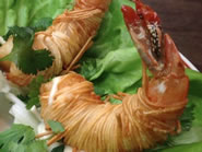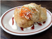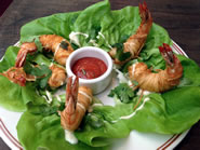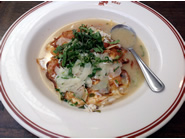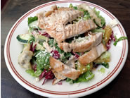 まずは、Crispy Shrimp CocktailとCaesar Salad、それにマッシュド・ポテトの天ぷらを選びました。エビにそうめんをぐるぐると巻いて揚げたクリスピー・シュリンプは、付け合せのカクテル・ソースをつけていただきます。サクサクのそうめんは細いプレッツェルのように香ばしく、中のエビも大きくてプリッと身が引き締きしまり歯ごたえも抜群。エビはこんがりとよく揚げてあるのでしっぽまでサクサクで、柔らかいビブ・レタス(サラダ菜)に包めば、よりさっぱりと食べられます。グリルド・チキンをトッピングしてもらったシーザー・サラダは、スモール・サイズにもかかわらず、二人でシェアしても十分なボリューム。シャキシャキのレタスに甘い生いんげん、カリカリのクルトン、それにアンチョビのフリッターとモッツアレラ・チーズをアクセントに使っているのが特徴です。白っぽい衣の中に荒く潰したマッシュド・ポテトを詰めて揚げた天ぷらは、日本の中濃ソースのような甘酸っぱいBBQソースとランチ・ドレッシングが添えてあります。サックリと揚がったポテトは天ぷらと言うよりもコロッケに似ていて、口の中で溶けるようなフワフワとしたじゃがいもの食感がヤミツキになりそう。