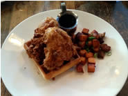 まずはBreakfastメニューからFried Chicken & WaffleとSunny Side Duck Egg Hushを、LunchメニューからPloughman's PlatterとGarlic Pork Sausage Sandwichをオーダーしました。ワッフルが隠れてしまうほど大きなフライドチキンののったワッフルは、チキンの衣がカリカリとしていて中はとってもジューシー。鶏肉はあっさり塩味なので甘さ控えめのワッフルとも相性がよく、それぞれ個別に食べてもフワフワのワッフルと一緒に食べても◎。サイコロ状に切ってカリッと焼いてあるサイドのSweet Potato & Pork Belly Hashも、ホクホクとしたスイートポテトに豚バラ肉があっていてなかなかのお味。サニーサイド・ダックエッグハッシュは、ほぐしたアヒルのコンフィと炒めたジャガイモの上に、これ以上ないくらい綺麗な形の目玉焼きがのっています。コンフィは低温でじっくりと調理しているので味がとてもまろやかで、濃厚な香りが漂うブラックトリュフと奥深い味わいのビネグレットソースのハーモニーもとっても上品。ランチメニューから選んだプラウマン(農夫)プラッターはマスタードをひいた長細い板の上に、当日のお勧めの食材とバケットがのったものですが、この日はの具材はポークリエット(ペースト)とハモンセラーノ(生ハム)、小魚のマリネ、ピクルス、半熟たまご、レタス、レーズン、それにグリュイエールチーズでした。バゲットで好きな具を挟んで軽いサンドイッチにしてもいいですし、ワインを飲みながらちょこっとずつつまむにもピッタリのお洒落な一品。ガーリックポーク・ソーセージのサンドイッチは、短いフランスパンでニンニクが程よくきいたソーセージとじっくり蒸し焼きにしたケールをたっぷりと挟んでいます。柔らかすぎず硬すぎないケールは独特の味がするものの、アプリコットのシロップ煮にピリッとしたマスタードを効かせたモスタルダが味のアクセントになっていて、そのユニークなフレーバーに飽きがきません。