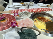 席に着くと、サーバーの方が丁寧に火鍋の説明をしてくれました。まずはベースとなるスープを選ぶのですが、スープには辛いスープと辛くないスープ、その二つを合わせたコンボスープ、ベビーバリトマトスープ、そしてマッシュルームスープの5種類があり、最大4つまで注文出来ます。今回はマッシュルームスープとコンボスープを頼みました。火鍋は寄せ鍋のように色んな具材を組み合わせて楽しむものなので、具材は肉類から魚介類、野菜類まで豊富に揃っており、飲茶でも見かける事の多い、希望する具材の数を専用のシートに記入するオーダー方式です。また、ダイニングエリアには、サラダや前菜、甘味、フルーツなどが並ぶセルフバーが設置されおり、鍋料理以外のものは、そこから自由に取ることができます。バーには火鍋のタレを作れるコーナーもあり、ごま油や赤唐辛子入りの真っ赤なタレ、ゴマダレ、醤油ベースのタレなどが揃っていますので、自分好みのタレを作ることが出来るのもの、同店の楽しみのひとつです。