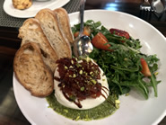 メインの前にオーダーしたNew England Clam Chowder は濃厚すぎず、かといって淡泊でもない、絶妙なバランスです。ベーコンの旨みとクラムの潮の風味が見事に調和し、添えられたチャイブ入りチェダービスケットのサクサク感がよいアクセントになっています。人気メニューのBurrata Saladは、ルッコラ、いちご、ピスタチオ、薄切りフェンネルを合わせ、エクストラバージンオリーブオイルとバルサミコドレッシングでシンプルに仕上げた一皿。サイドには大きなブルラータチーズが添えられており、下にはピスタチオとバジルペースト、上にはトマトジャムがトッピングされています。香ばしくほろ苦いクロスティーニに、サラダと甘酸っぱいソースのかかったチーズをのせていただけば、甘み・苦み・酸味が一度に広がり、口の中で豊かなハーモニーを奏でます。