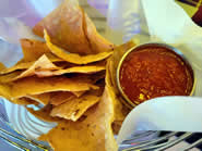テーブルサービスで出されるチップス&サルサ フレッシュなアボカドと新鮮な野菜をたっぷり使ったワカモレには三種類のチップスがついてきます