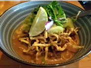 Entreesからはタイ風カレーうどんともいえるKao SoiとSon In Law Eggsという丼を頼みました。Kao Soiはココナツの風味が漂うタイカレーに中太のエッグヌードルが入っています。しっかりと煮込んだカレーにはホロホロと柔らかい牛肉の他に、カリカリに揚げたエッグヌードルとシラントロ、ライム、それに高菜がのっているので、食感や味のハーモニーがトッピング次第で広がります。もう一つのSon In Law Eggsはタイ米の上に揚げたゆで卵とシラントロ、それにスパイシーバジルビーフが綺麗に並べられていて、その彩りや具の取り合わせはまるで日本の三食丼のようです。ピリッと甘辛いお肉がとにかくご飯とピッタリで、シラントロの香味がさらにエスニック感をアップさせています。今回はあえてサイドに添えてもらいましたが、通常はSweet Tamarind Sauceが丼の上にかけられています。どちらのお料理もアメリカのレストランにしては量が控えめな印象ですが、取材班にはちょうどよいボリュームでした。