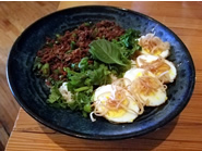 醤油ベースのタレに漬け込んで焼いたMoo Pingは、お肉が柔らかくてジューシー。 タイ風カレーうどんともいえるKao Soiは多様なトッピングで味や食感のハーモニーが広がります。 タイ米の上に揚げたゆで卵とシラントロ、スパイシーバジルビーフをのせたSon In Law Eggs。