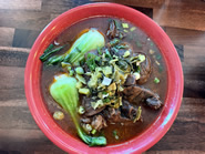 グリーンビーンズ、ポテトと一緒にギッシリと盛られたポップコーンチキンは五香粉が効いています 軽く揚げたバオでポークと高菜、コリアンダーを挟んだHouse Pork Belly Bao-wic 台湾の牛肉麺Spicy Beef Noodle Soupには分厚い牛のすね肉が4枚ものっていてボリューミー