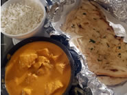 ゴロゴロと鶏肉の入った食べ応えのあるTikka MasalaとGarlic Naan 香ばしく焼いたタンドリー(鶏肉、ラム肉と野菜)に具のないカレーがついたTandoori Platter