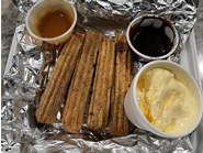 Homemade Churrosはシナモンメープルシュガーがまぶしてあり、サイドにチョコレートシロップとカラメルシロップの2種類のディップ、それにバニラアイスクリームがついてきます。好みによりますが、取材班にはカラメルシロップにアイスクリームのコンビネーションが好評でした。
