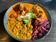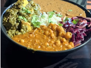 今回はお昼に訪れたのでランチスペシャルのRice Bowlsを頼みました。カレーは家族代々に伝わる秘伝レシピを元に作っているそうです。Rice Bowlは選べる三つのエントリー(カレー)にサラダ(酢漬けの野菜)がバスマティライスの上にのっているもので、今回はチキンカレーと豆のカレーのセット、もう一つにはチキンカレーとチーズカレーのセットを選びました。運ばれてきたお皿はカレーの黄色やオレンジ、香菜の緑、赤キャベツやニンジンなど見た目から元気になれそうなビタミンカラーが一杯で、食欲をそそります。お味のほうはというと、全体的にカレーは甘めの印象でどれも食べやすく、特にチキンは中までしっとりとしていてココナツ味のカレーソースにピッタリでした。ひよこ豆のカレーも豆の硬さがちょうど良く、何とも言えない舌ざわりにウットリしてしまいます。カレーは別注文した自家製の出来立ての熱々のナンとも一緒にいただきました。ナンはプレーンの他に、ガーリックオイルを塗ったものもあります。チーズカレーにはほうれん草ベースのカレーにインドのカッテージチーズとも言われるパニールというチーズが入っているのですが、ほうれん草の苦みがほんのりと効いたソースに合っていてなかなか良かったです。トライしたRice Bowlはディナーでも注文できますが、3時以降は値段が上がるのでどうせならランチ時間にオーダーするほうがお得でお勧めです。