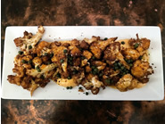 スパイシーなフェタチーズディップの上に、フライドカリフラワーをのせたKounoupidi tiganito