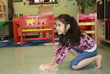 うみぐみ(5・6歳児クラス)の子ども達は、毎日、教室を自分達でお掃除する事が日課となっています。アメリカの幼稚園や学校では、用務員さんがお掃除してくれるのが当たり前です。聖マタイ幼稚園にも用務員さんがいて、以前はすべて任せていましたが、最近は、子ども達の出来る所は自分達で掃除させていただく事になりました。子ども達に自分の使う教室(自分の身の回りの物)を責任を持って大切に管理する事を学ぶという目的もありますが、私がまず子ども達に伝えた事は、毎朝整えられた教室で学ぶ事が出来る事は、用務員さんをはじめ、周りの人たちの支えがあるからという事に感謝を感じて欲しいという事でした。