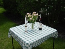 キャンプ場に添え付けてあるテーブルを使ってもいいけどあれはデカイ。折りたたみ式テーブルにクロスを敷いた方が密接感が上がるよね。