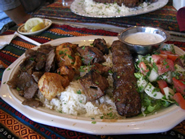 先輩「おっと、メインの登場だ。最初のはケバブの盛り合わせコンボ。チキンと、ドネル(ギロスに使われているのと同じ肉)、羊ひき肉、そして羊のシシケバブの4種類だ。」