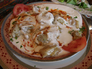 先輩「ははは、手厳しいなあ。でも確かにこれだけでも充分満足できるよね。お、次に出てきたのはMantiっていうトルコ風水餃子だよ。見栄えは中華の影響を受けてるけど、これにホットペッパーなどの香辛料が入ったヨーグルトソースをかけてたべるんだよ。」