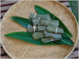 沖縄のムーチー(餅)を紹介します。餅はうすを使わないのが特徴です。餅粉に砂糖を混ぜたものを水でこねて、ショウガ科の植物月桃(サンニン)の香ばしい葉っぱで20センチほどの大きさに包んで蒸します。これを子どもたちの健康を祈ってこどもの年のぶんだけ作り、すだれ様に編み込み柱などに吊るして新年をむかえます。家中その香りにいやされます。味はそれぞれの家庭によって異なりますが、こどもさんが生まれた家では初(はちムーチー)を作り、お隣さんや親戚、知人などに配って、共によろこんでもらいます。ちなみにお隣さんは、今年は400個ぐらいは作ると言っていました。沖縄の新聞には、地域の人々が幼稚園や、小学校に出向き「ムーチーの歌」を合唱しながら こどもたちにその文化を継承している ほほえましい記事が目にとまります。沖縄のお正月、体験してみてはいかがでしょうか?
