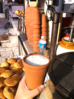 ラッシーと言えば、インド発祥のおいしいヨーグルトドリンク。塩あるいは砂糖を入れるもの、またフルーツを入れるものがあるらしいのですが、私はやはり甘いラッシー派。孫悟空ご自慢のお店(たぶん、彼の親戚の家)のラッシーワラへ寄ってから観光をはじめよう!という事に。アメリカなら「ドライブスルー・スタバ」ですが、ここでは「ドライブスルー・ラッシー」でして、車の中からオーダーして待つ事3分。たらいの中のヨーグルトにお好みのフルーツ(私はバナナ)を入れてくれ、混ぜ混ぜ。そこにカード(ヨーグルト堅い部分)も注いでくれ、はいどうぞ!と渡された入れ物、これがまるで石器次代のような粘度を焼いて作った入れ物でして、飲み終わったらそこら辺に捨てる、そして割る、土に戻る。。。ギリシャの結婚式みたい。味?もちろんアッチャー!(“おいしい”のヒンディー語)