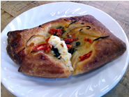 玉ねぎとゴートチーズ、トマトをトッピングして焼いた惣菜系のパンで、玉ねぎの甘みがアクセントに効いています。パン生地はクロワッサンというよりは、普通のパン生地を薄く伸ばして重ねたようなタイプです。 |