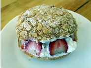 サクサクのそぼろをつけて焼いたパンの間に、たっぷりのホイップクリームとイチゴを挟んでいます。ジューシーな苺の酸味とクリームの甘さが、ホロホロとしたパンにしっとりとよくあっています。 |