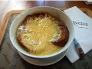 香ばしくカリッと焼いたバゲッドとオニオンがたっぷり入ったフレンチ・オニオン・スープは、思った以上にあっさりしていてほっとする優しい味わい。たっぷりと上にのっているチーズがコクを与えていて味のバランスはバッチリ。 |