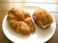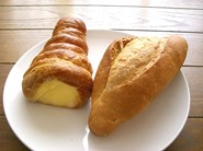 可愛らしいコルネの形をしたクリームパンは、ひとつでお腹いっぱいになりそうなジャンボサイズ。パンはデニッシュのような生地でちょっとパサついてる感じがしますが、たっぷり入ったクリームと一緒に食べると気になりません。このお店はカスタード系が得意なのか、このクリームもとっても滑らかで、甘さ控えめです。 |