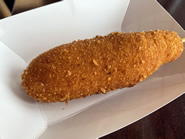 中の具のチーズはハーフかフル、もしくはチーズ無しを選べます。今回は少し欲張って半分チーズ&半分ソーセージのハーフ&ハーフでオーダー。とろ〜り伸びるチーズがたっぷり入っていて、思った以上に食べ応えがありました。チーズ好きの方はフルチーズで頼むことをお勧めします。揚げたてのコーンドッグは外側がカリッとしていますが、生地はドーナツ生地と同じくモチモチ食感で美味。プレーンの他に、周りにスナックのチートスやドリトスを絡めて揚げたユニークなものもあります。 |