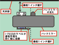 デバイスは右図のようにバックミラーの直ぐ裏側に付着するのですが、最低天井部から最低1インチは離してください。