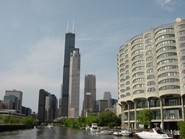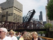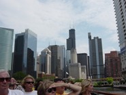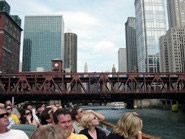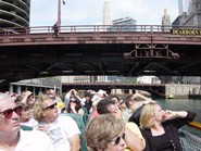 2階建てのボートは2階が屋根の無いオープンエリアになっていて、バーもついている1階はチェリーオークのインテリアがお洒落な雰囲気の良い感じでした。シカゴリバーでは他にも色んなボートツアーが運行していますが、CAF(シカゴ建築ファンデーション)の公認ボートツアーはファーストレディーだけ。しかも一番高級感があると言われています。乗客が席に着き、船が出航するとガイドさんによるシカゴ川沿いにある建築物の説明がはじまります。『建築物ツアー』というとお堅いイメージを想像してしまう人もいるかも知れませんが、例え建築に興味が無くても、天気の良い日にノンビリとビール片手に遊覧船気分の川くだりを楽しむだけでも充分価値はあります。それに熱心なガイドさんの説明は裏話も満載で興味深々ですし、川から見上げる景色はいつも見慣れたシカゴとは違った印象を与えてくれます。色んな形の建築物にそれぞれテーマがある事を知ると、シカゴに新たな親近感がわくはずです。